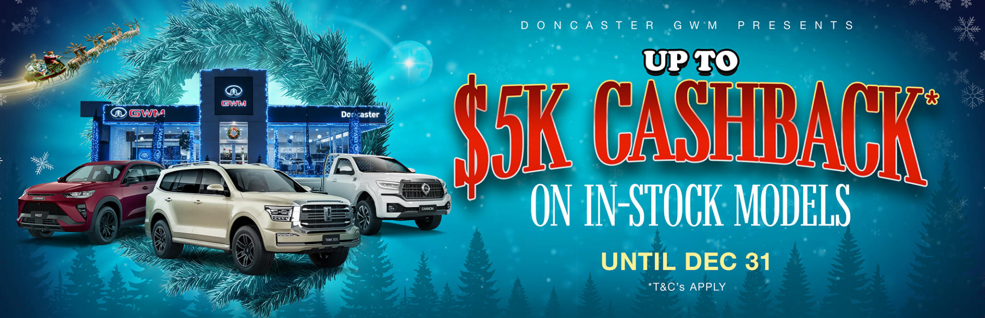 Terms and Conditions: *Offers available on selected new, in-stock GWM models purchased and delivered by December 31, 2025, or while stock lasts. Cashback amounts vary by model. “Up to $5,000 Cashback” applies only to new TANK 500 models. Cashback is applied at the time of purchase as a deduction from the final vehicle price. Not available in conjunction with any other offer. Excludes fleet, government, rental, and taxi buyers. Doncaster GWM reserves the right to modify or withdraw this offer at any time.